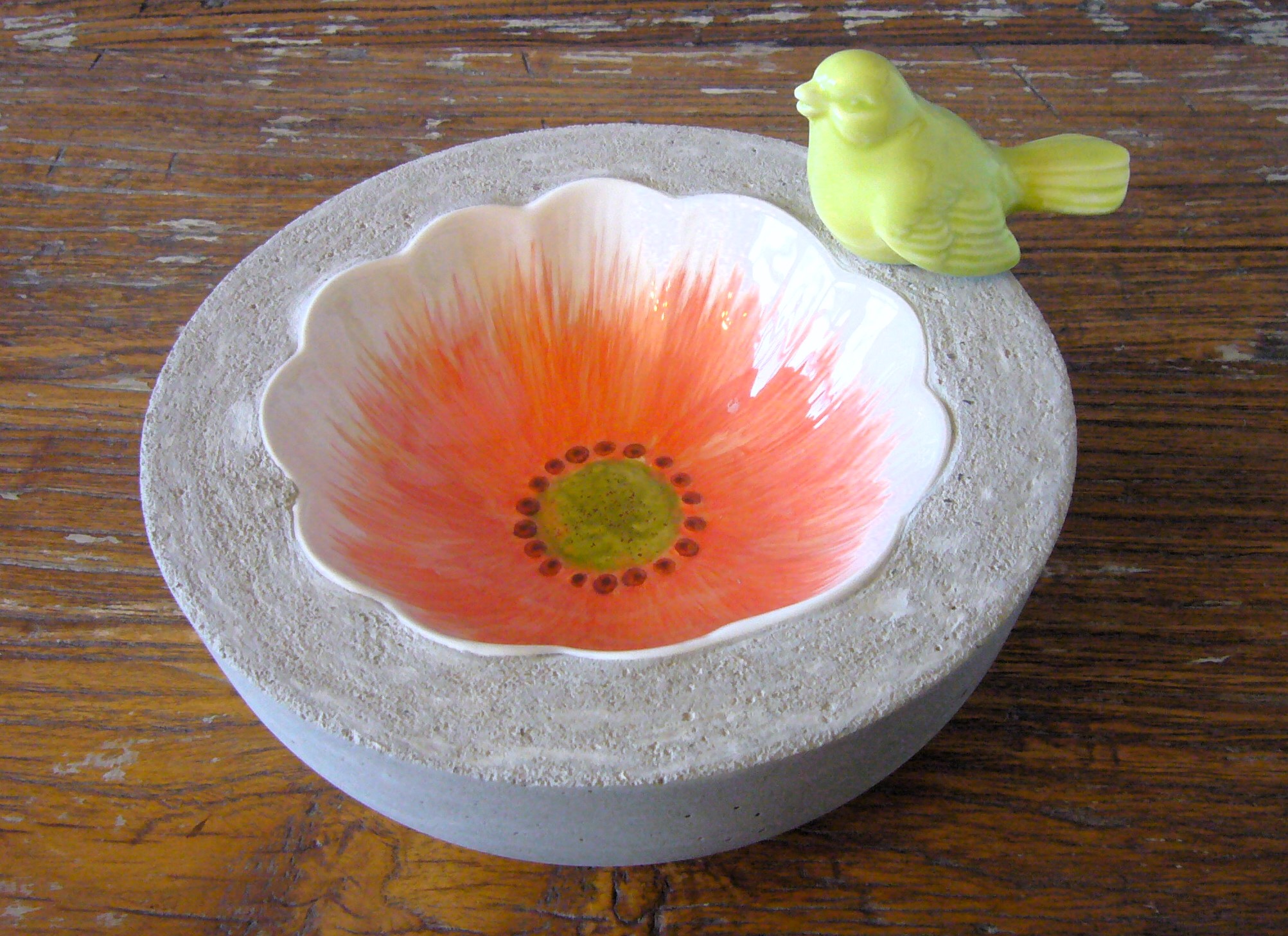 Eine schöne Kombination aus rauem Beton und edlen Porzellan oder Keramik. Die Vogeltränke wird je nach Auswahl des Designs mit Varianten farbiger Porzellan-Vögel oder auch Blumen versehen. Alle Tränken sind mit einer Betonimprägnierung versehen und mit Silikon-Stopper für einen sicheren Stand ausgestattet.